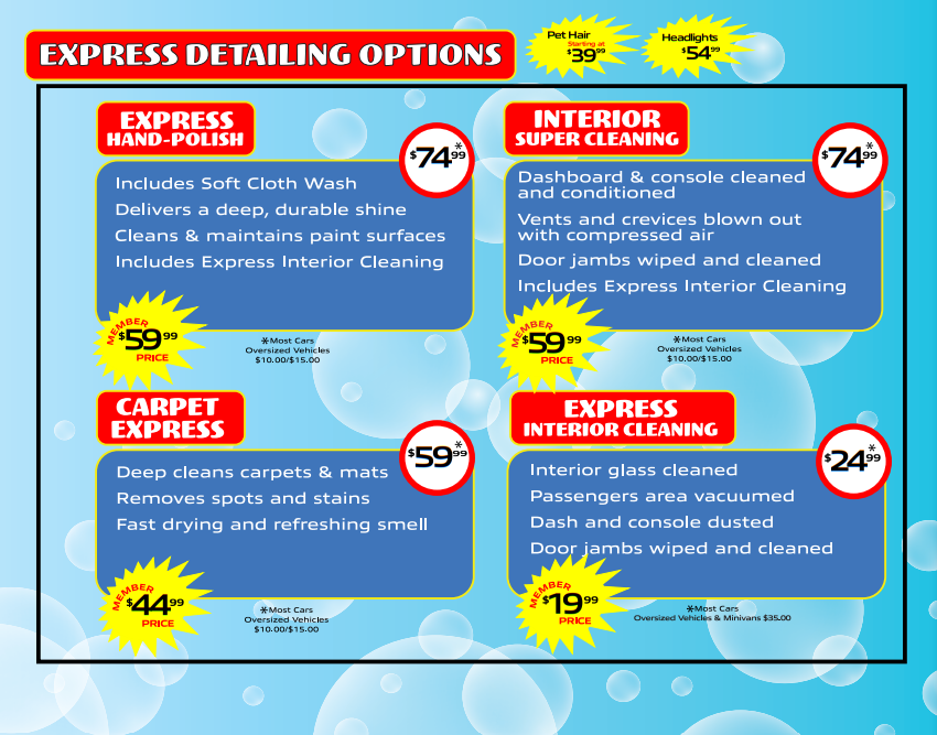 Our Unlimited Car Wash Club is a truly unlimited program. We don’t limit you to one car wash per day like our competitors. Join the club for a low monthly rate and wash your car as often as you’d like! Club members also get discounted rates for our express detail services.